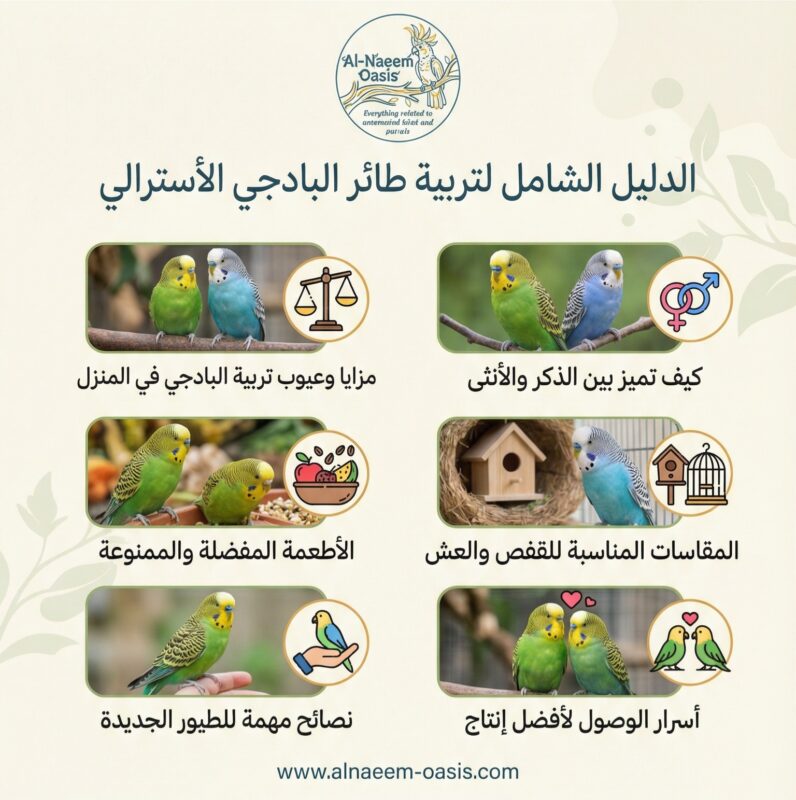 يُعد طائر البادجي الأسترالي (Budgerigar) “ملك الطيور” في المنازل حول العالم، فهو ليس مجرد طائر زينة، بل هو رفيق ذكي، حيوي، وسهل التربية. إذا كنت تفكر في دخول عالم تربية الطيور، أو تبحث عن تطوير إنتاجك، فهذا الدليل من “واحة النعيم” هو رفيقك الأمثل.